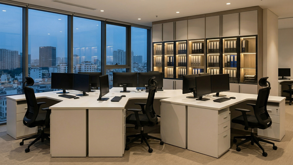 Thi công trọn gói hệ thống bàn làm việc nhân sự, tủ hồ sơ kịch trần và bàn họp. Tối ưu năng suất làm việc.
